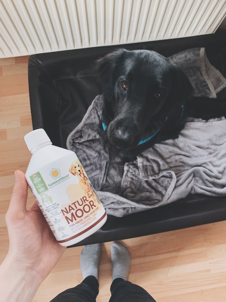 Wir geben Nero momentan täglich zur Unterstützung beim Futterwechsel etwas flüssiges Naturmoor mit in sein Futter. Nero ist jetzt ein Jahr alt, bekommt nun nicht mehr sein Junior Futter und sein Darm tut sich mit der Umstellung gerade noch etwas schwer. Aber das sollten wir bald in den Griff bekommen 🙂